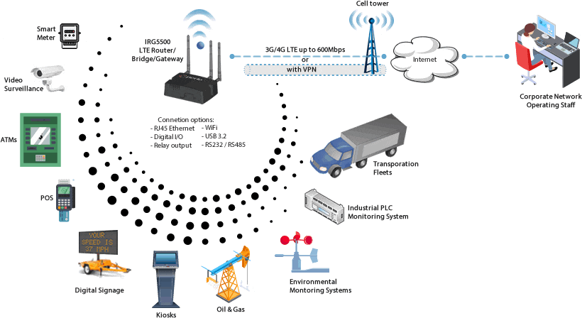 IRG5540+ LTE Router with integrated: LTE-A PRO (CAT12 600M / 150M), GNSS, 4 x 10/100/1000 RJ45 Ethernet, USB-C Port, RS232, 3 x GPIO, IGN (ignition sense pin), Relay output, RS485 half-duplex, IP54 enclosure. Power supply included.